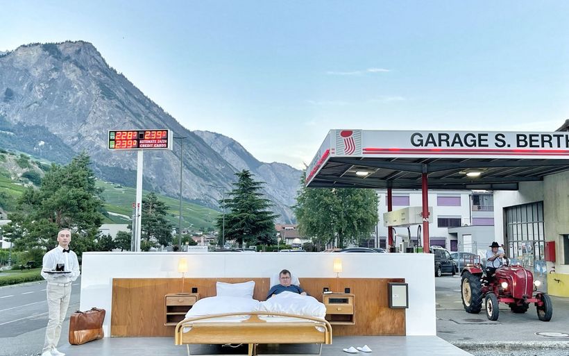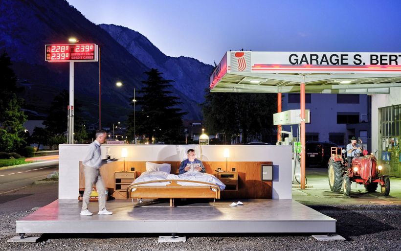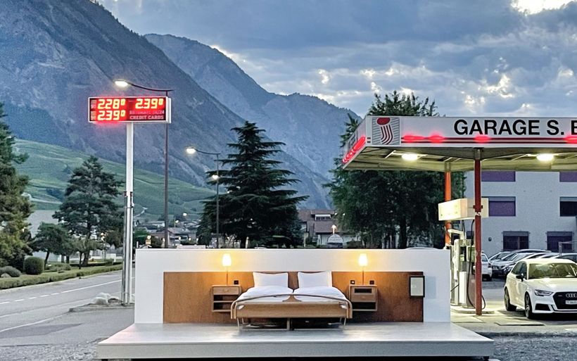 Ein Bett und zwei Nachttische zwischen einer Tankstelle und der Hauptstrasse: Die Brüder und Konzeptkünstler Frank und Patrik Riklin sowie der Hotelier Daniel Charbonnier lancieren in der Walliser Gemeinde Saillon eine anti-idyllische Version ihres «Null Stern Hotels».
