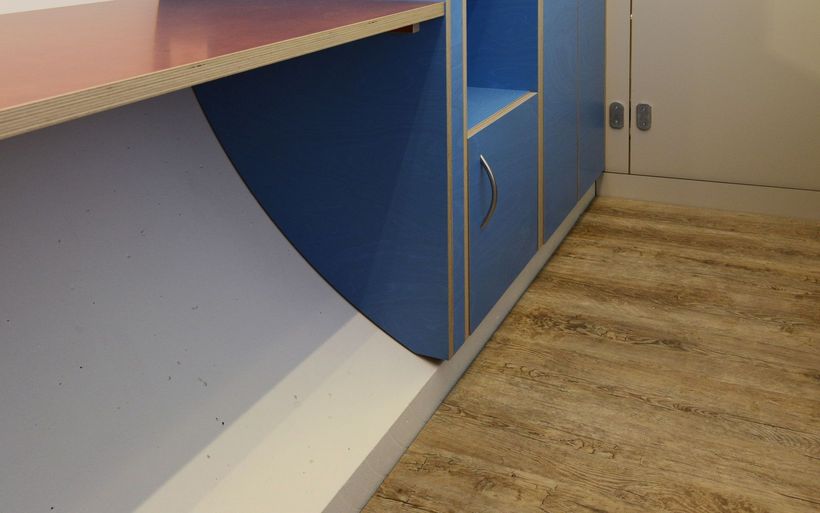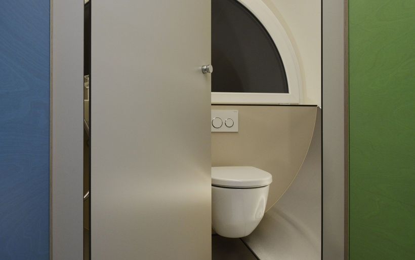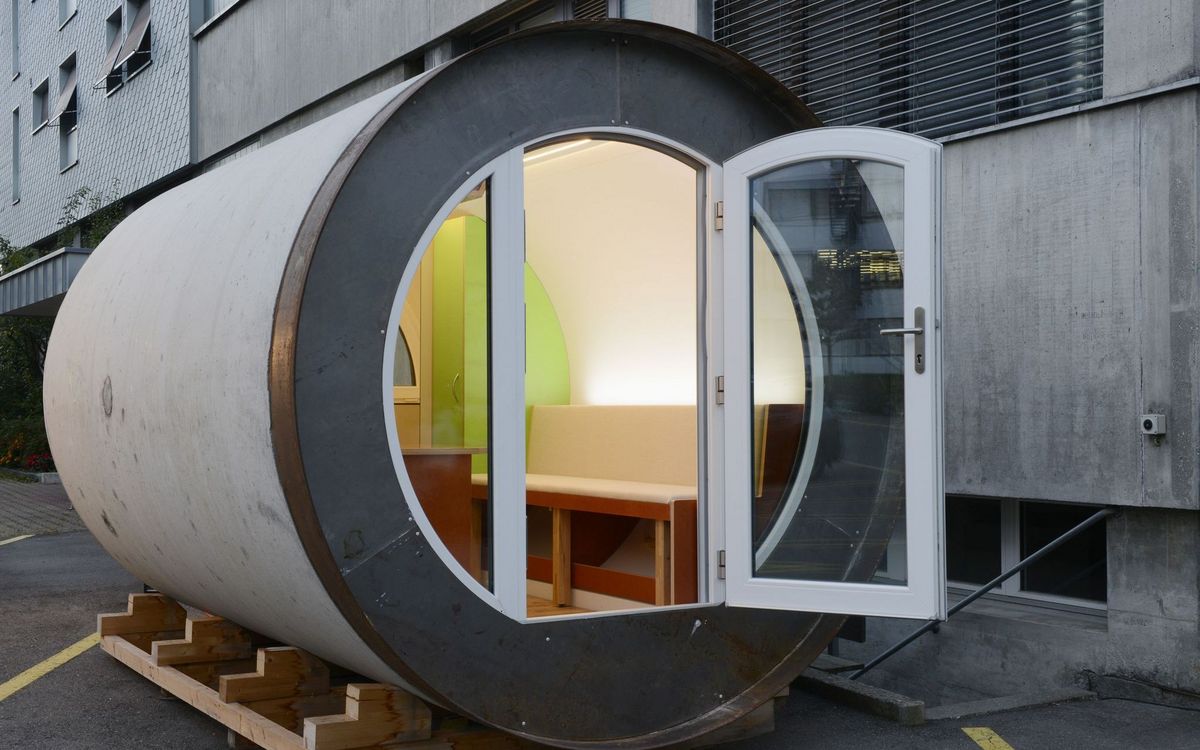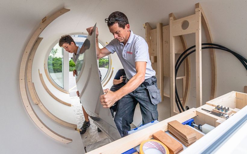 Das elektrifizierte Röhrenzimmer verfügt neben Schlafsofa, Tisch und Einbauschränken über eine durchdachte Badeinrichtung inklusive Lüftung sowie eine Fussbodenheizung. «Ob begehbarer Kleiderschrank oder beheizte Hundehütte – Spezialanfertigungen sind unser Steckenpferd», sagt Schreinermeister Rolf Brändle. «Eine kompakte Zimmerausstattung in einem kreisrunden Raum ist aber durchaus nichts Alltägliches. Die Herausforderung besteht darin, auf kleiner Fläche umfassenden Komfort zu bieten und dabei trotzdem ein grosszügiges Raumgefühl zu erzeugen». Wie die Herausforderung gemeistert wurde, können die Besucherinnen und Besucher der Zuger Messe bestaunen.