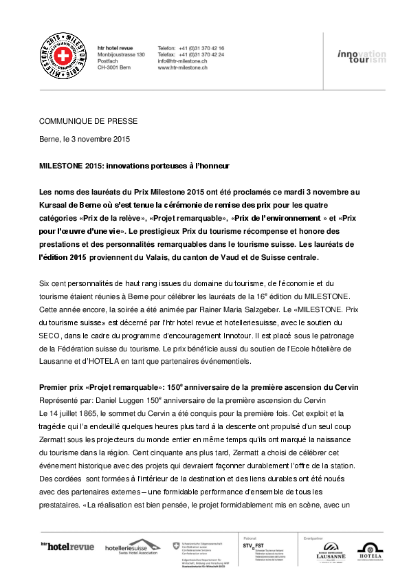 | MILESTONE. Tourismuspreis Schweiz Der Tourismuspreis Schweiz» wird von der htr hotel revue und hotelleriesuisse verliehen und vom SECO im Rahmen des Innotour-Förderprogramms unterstützt. Der MILESTONE steht unter dem Patronat des Schweizer Tourismus-Verbands. Die Ecole hotelière de Lausanne und die HOTELA unterstützten den MILESTONE als Eventpartner. |
