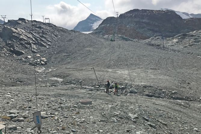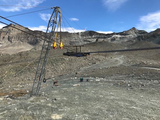 Von Laghi Cime Bianche aus sollten die neuen Seile via Furggsattel dann nach Trockener Steg gezogen werden. Damit die neuen Seile jedoch überhaupt auf Reise gehen konnten, mussten in den vergangenen Wochen einige Installationen vorgenommen werden. So wurde eine provisorische Seilbrücke, abgestützt auf vier temporären Stützen montiert um das Vorseil zu ziehen. Das viel weniger schwere Vorseil konnte von der italienischen Seite aus mit dem Helikopter auf den Furggsattel transportiert und von da mit einem Hilfslaufwerk via der Seilbrücke nach Laghi Cime Bianche gezogen werden.