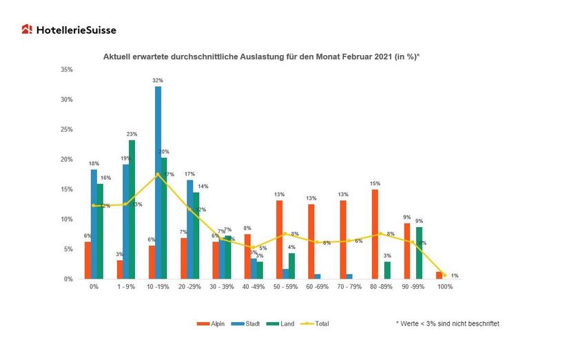 Eine etwas bessere Auslastung erzielten Hotel-Betriebe in den Bergregionen aufgrund der guten Witterungsverhältnisse und den offenen Skigebieten. Gemäss den neusten Prognosen in den alpinen Regionen liegen die Auslastungen im Februar 2021 im Durchschnitt bei rund 50 Prozent (im Vergleich zu 2019: 57 %). Dennoch sind mehr als ein Drittel der Betriebe (36 %) zu weniger als der Hälfte ausgelastet.