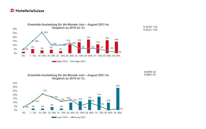 Das Ausbleiben ausländischer Gäste, Einschränkungen bedingt durch den Teillockdown und die fehlende Planungssicherheit dämpfen auch die Hoffnungen auf eine gute Auslastung im Sommer. Die Auswertungen der Rückmeldungen der befragten Hotels zeigen, dass die Buchungszahlen für die Monate Juni bis August 2021 sowohl in ländlichen wie auch in alpinen Regionen massiv unter den Werten von 2019 liegen. So bewegen sich die aktuell erwarteten Auslastungen für die kommenden Monate bis August mit zwischen 20 und 30 Prozent im niedrigen zweistelligen Prozentbereich.