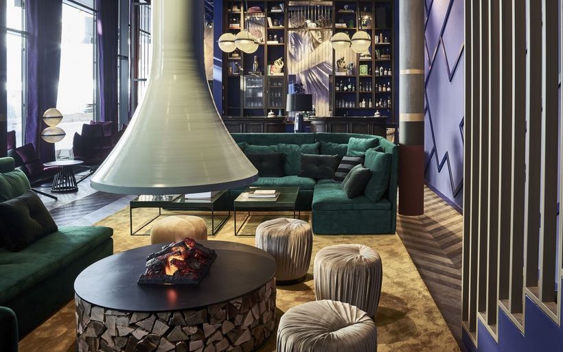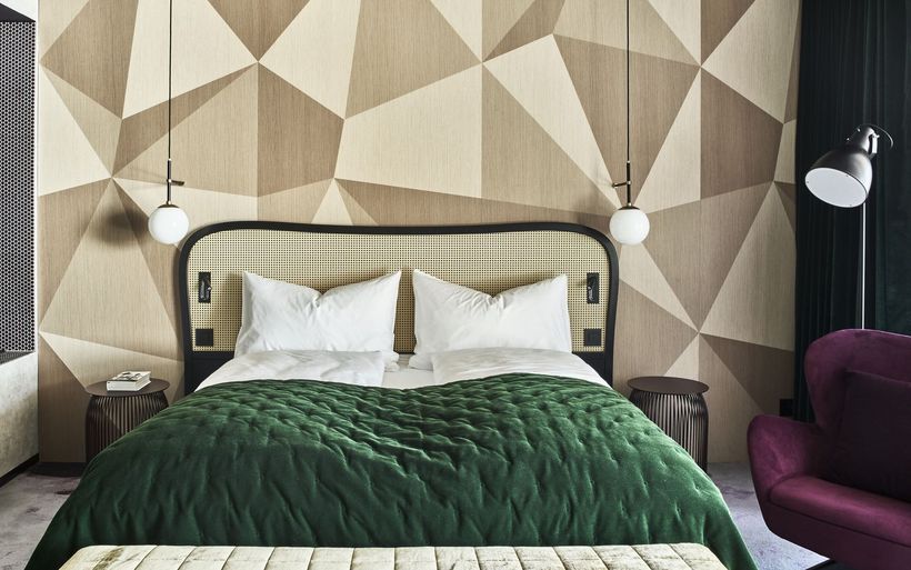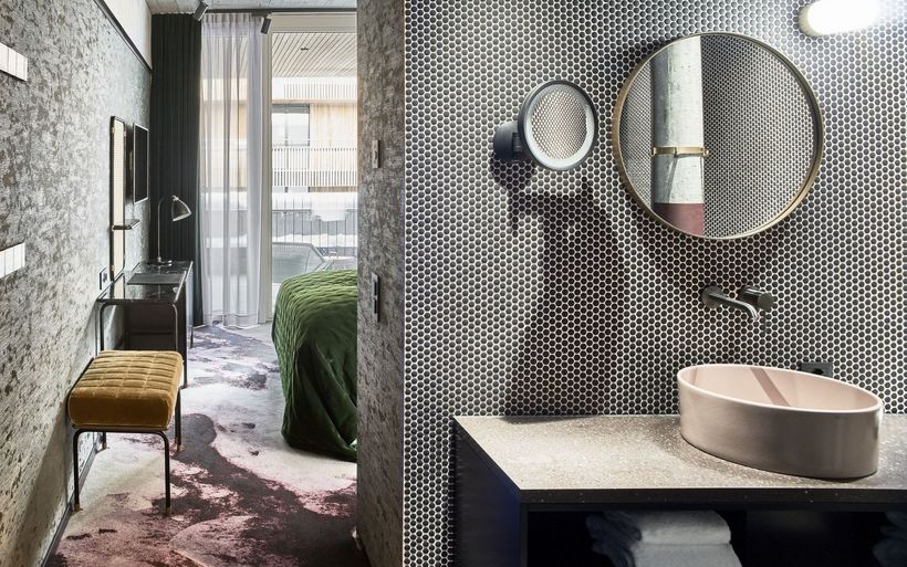 Die 47 Gästezimmer und Suiten im obersten Stockwerk habe Erik Nissen Johansen von Stylt Trampoli eindrucksvoll in Szene gesetzt, schreibt Design Hotels weiter. Oszillierende Tapeten und juwelenfarbene Samtstoffe harmonieren mit geometrischen Wandverkleidungen und raumhohen schwarzen Mosaikfliesen. Akzente aus Messing und geschickt hängende Beleuchtungen runden das Ambiente ab.