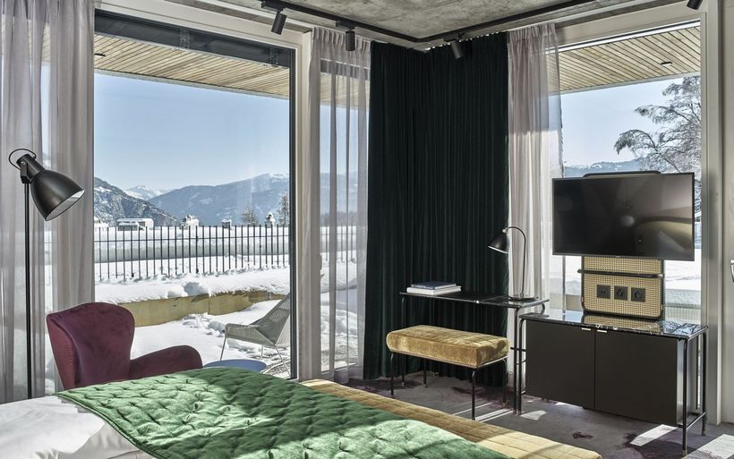Jedes Zimmer verfügt über eine private Terrasse, von der aus man direkt ins weite Tal und die umliegenden Berge blickt. Die öffentlichen Räume seien eine gelungene Kombination aus Gemütlichkeit und Raffinesse. Unbearbeitete Decken mit freiliegenden Rohren, Metrofliesen und markante Säulen treffen auf gewagte Tiefflorteppiche, üppige Vorhänge und intime Ecken, die zum Verweilen und Zuschauen einladen. Die hohe, doppelstöckige Eingangshalle – mit einem Wandgemälde des Künstlerduos Bane&Pest, reich gefüllten Regalen und einem scheinbar schwebenden Kamin – sei ein Ruhepol par excellence.
