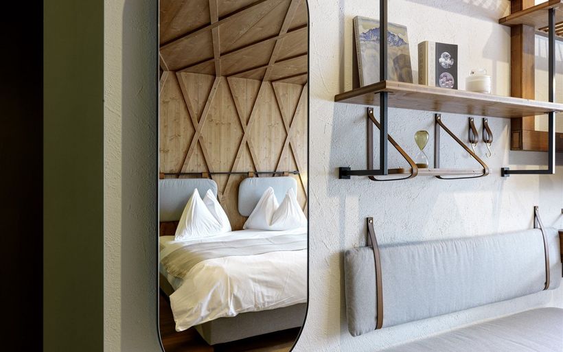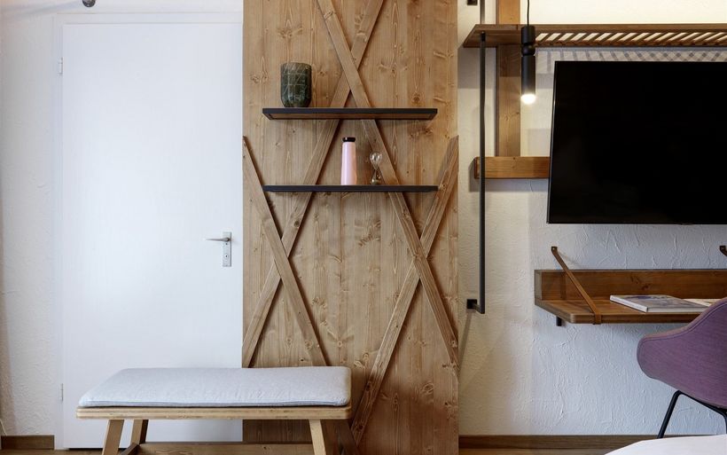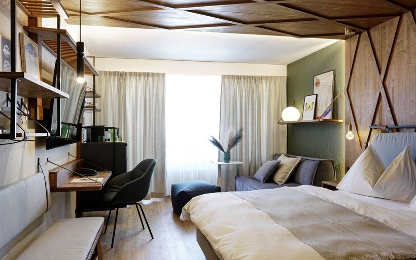 In jedem Zimmer ist der Eingangsbereich durch die Farbgebung einem der drei Naturthemen Berge, Wald oder Wärme gewidmet. Dieser Bereich dient als Übergangszone zwischen der aktiven Aussenwelt und dem privaten Entspannungsparadies. Die warme und grossflächige Verkleidung aus Arvenholz an der Decke und an der Wand definiert den Schlafbereich. Das Herzstück des Zimmers bietet dem Gast Geborgenheit und Ruhe. Durch die hellen Farben und die Ausrichtung an das natürliche Tageslicht ist der Aufenthaltsbereich ein Ort des Aufwachens. Der mit hellen Farben gestaltete Fensterbereich dient dem Aufenthalt und der Aktivität.