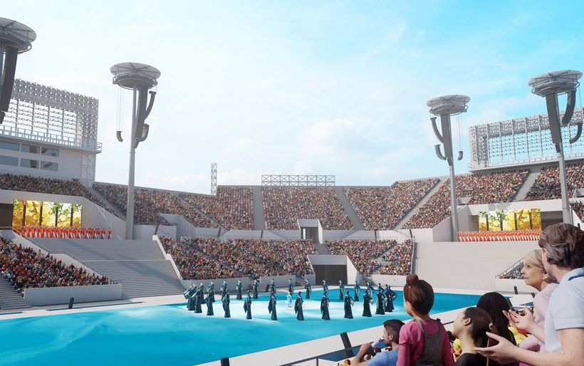 Lärm vom Bohren, Hämmern und Sägen durchdringt die Baustelle. Der Bau der Struktur der Arena ist zwar abgeschlossen, aber noch sind die Bühnentechniker damit beschäftigt, das Stadion mit Ton und Licht auszustatten. Zwischen 50 und 60 Personen arbeiten gegenwärtig auf der Baustelle.