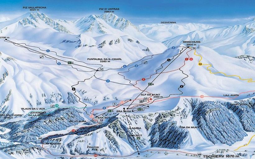 Eine zweite Skibrücke wird in eleganter Holzbauweise für die Talabfahrt über die Kantonsstrasse erstellt. Die Beschneiungsanlage Minschuns – Prà Chalchera bezieht dann das Wasser aus dem im Winter stillgelegten Kieswerk Piz Daint. Schliesslich soll ermöglicht werden, dass die Talabfahrt in eine gepflegte Beschäftigungspiste überführt wird.
